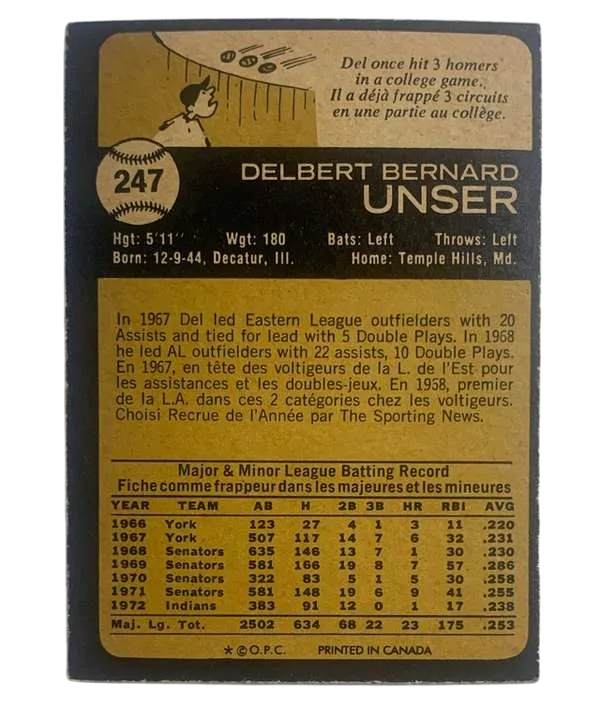 Step back in time with this authentic 1973 O-Pee-Chee baseball card featuring Del Unser of the Cleveland Indians. A treasured piece for any collector, card #247 captures the essence of the era with its classic design and vintage appeal. Manufactured in Canada, this original card is a nod to the rich history of America's favorite pastime. Delve into the nostalgia of the Major League Baseball with this timeless collectible.