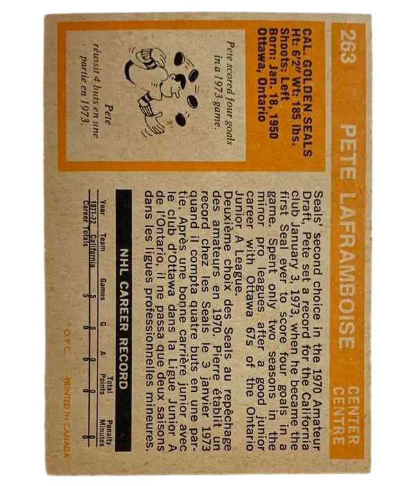 Embrace a slice of hockey history with the #263 Pete Laframboise rookie card from the 1972-73 O-Pee-Chee set. This vintage collectible features the legendary California Golden Seals player, capturing the early days of a memorable NHL career. Manufactured in Canada during the height of the sport's popularity, this original card is a must-have for enthusiasts and collectors alike. With its standard card size and rich detail, the piece serves as a tangible connection to the National Hockey League's storied past.