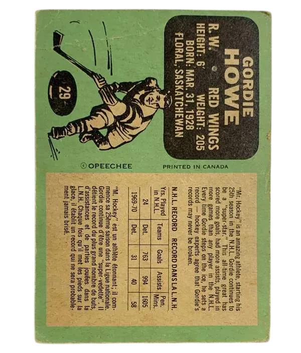 Celebrate a piece of hockey history with this #29 Gordie Howe card from the 1970-71 O-Pee-Chee set. This original sports trading card features the legendary Gordie Howe of the Detroit Red Wings, captured during an iconic season. With its standard card size, it fits seamlessly into any collection, ensuring the legacy of one of ice hockey's greats is preserved. Crafted by O-Pee-Chee and hailing from Canada, this card is a tribute to the National Hockey League's rich past.