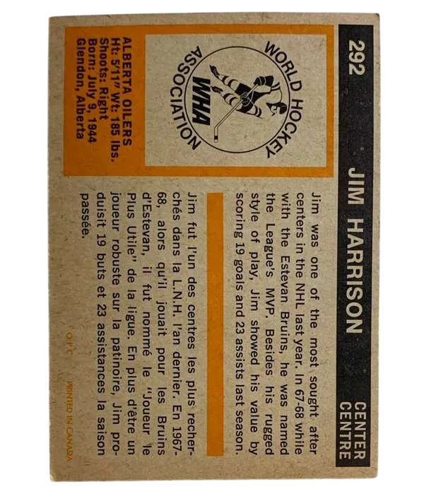It's a must-have for enthusiasts of the game and collectors who value the legacy of the WHA and the skill of Jim Harrison. Add a touch of nostalgia to your collection with this classic sports trading card.