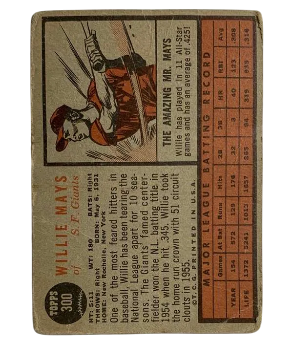 Capture a piece of baseball history with the #300 Willie Mays 1962 Topps Baseball Card. This iconic piece showcases the legendary San Francisco Giants player in his prime, making it a must-have for collectors and fans alike. The card, part of the revered 1962 Topps set, comes in standard size and is an original print, hailing from the United States. The card celebrates a remarkable season and is a vintage treasure for those who appreciate the sport's rich heritage. It's a classic representation of one of Major League Baseball's most celebrated athletes, offering a glimpse into the sport's golden era. Whether for a personal collection or as a thoughtful gift, this Willie Mays card is an enduring symbol of baseball legacy.