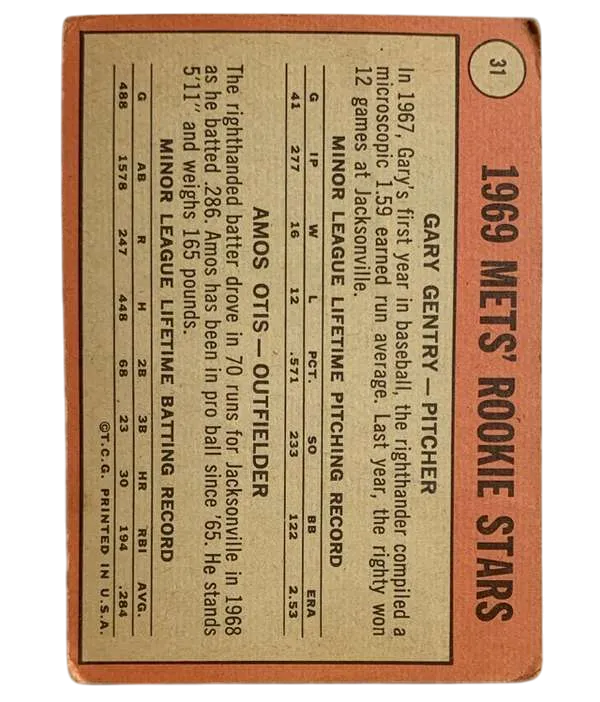 Step back in time with this #31 1969 Topps Baseball card featuring the Rookie Stars of the New York Mets, Gary Gentry and Amos Otis. A true vintage collectible, this card hails from a classic series that captures the essence of the sport during a pivotal era. The card is a cherished piece of MLB history, showcasing two players who made their mark on the game. Crafted in the United States, this original piece is a must-have for enthusiasts and collectors alike.