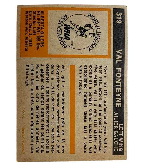 Discover a piece of hockey history with the #319 Val Fonteyne 1972-73 O-Pee-Chee sports trading card. This original card features the legendary Edmonton Oilers player, capturing the essence of his contribution to the sport during the 1972-73 NHL season. Crafted by the renowned manufacturer O-Pee-Chee and hailing from Canada, it's a true gem for collectors and fans alike. Belonging to the iconic 1972-73 O-Pee-Chee set, this card is a testament to the rich heritage of ice hockey and the National Hockey League.