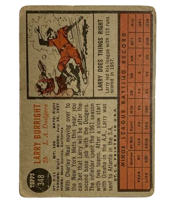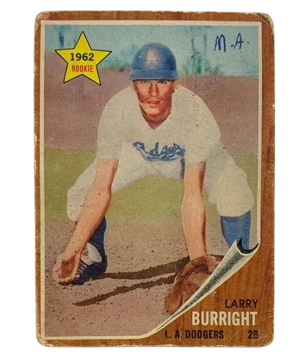 Capture a slice of baseball history with this authentic 1962 Topps Baseball Card featuring Larry Burright of the Los Angeles Dodgers. As part of the renowned 1962 Topps set, card number 348 showcases Burright in his rookie season, making it a prized piece for collectors and fans alike. The card is a classic representation of the sport, produced in the United States with the standard card stock material and measures the usual 20 Pt. in thickness. This original, non-autographed collectible echoes the vintage era of Major League Baseball and comes in English.