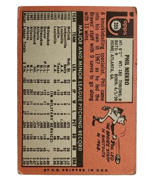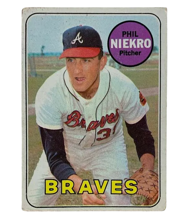 Capture a slice of baseball history with the #355 Phil Niekro 1969 Topps Baseball Card. Representing the Atlanta Braves, this card celebrates the illustrious career of the knuckleballer from the 1969 MLB season. A must-have for collectors and fans alike, it's a genuine piece of sports memorabilia that pays homage to one of the game's most intriguing pitchers.Crafted by Topps, a trusted name in sports trading cards, this item hails from the iconic 1969 set, renowned for its classic design and collectability. Made in Canada, it adheres to the standard card size and offers a glimpse into the rich past of America's favorite pastime through a lens of exceptional craftsmanship.