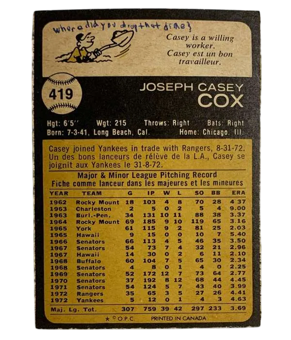 Delve into the history of baseball with the #419 Casey Cox 1973 O-Pee-Chee Baseball Card. Celebrating an iconic era, this card features the New York Yankees' pitcher from the 1973 Major League Baseball season. A true gem for collectors, it's a vintage piece from the revered 1973 O-Pee-Chee set, known for its detailed photography and classic design. Crafted by O-Pee-Chee, a notable manufacturer in sports memorabilia, this card is a tribute to the athlete's legacy on the mound.