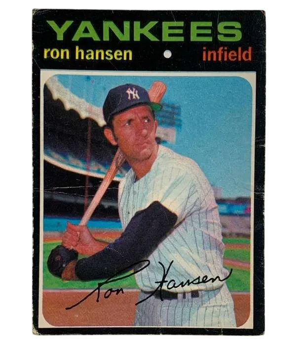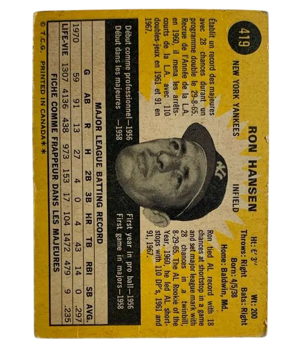Capture a piece of baseball history with this 1971 O-Pee-Chee baseball card featuring Ron Hansen of the New York Yankees. With card number 419, this collectible is a must-have for any serious baseball memorabilia enthusiast or fan of the sport. The card celebrates a standout season and is a tribute to Hansen's contribution to the game. Proudly manufactured in Canada, this sports trading card is part of the revered 1971 O-Pee-Chee set and is a classic example of the era's OPC parallel/variety.It's a timeless keepsake that commemorates the rich legacy of Major League Baseball and the storied history of the New York Yankees.