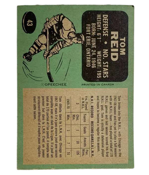 #43 Tom Reid Rookie Card 1970-71 O-Pee-Chee