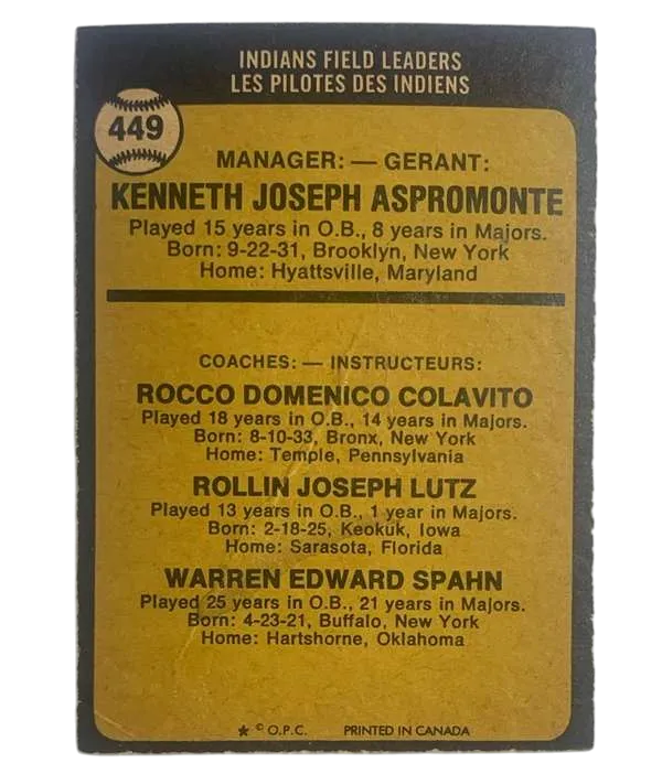 #449 Indians Field Leaders (Ken Aspromonte / Rocky Colavito / Joe Lutz / Warren Spahn) 1973 O-Pee-Chee