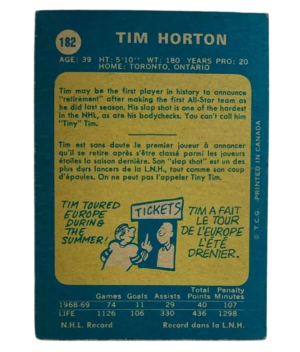 Celebrate a slice of hockey history with the #45 Tim Horton 1969-70 O-Pee-Chee Hockey Card. Featuring the legendary Toronto Maple Leafs defenceman, this vintage card is a must-have for collectors and fans alike. From the iconic 1969-70 O-Pee-Chee set, it captures the essence of the sport during a revered era of the National Hockey League. Crafted with care in Canada, this piece of memorabilia is a testament to Tim Horton's enduring legacy on the ice. As an official OPC parallel/variety, it stands as a unique and valuable addition to any sports trading card collection. Honour the past while investing in a timeless piece of hockey heritage with this classic Tim Horton card