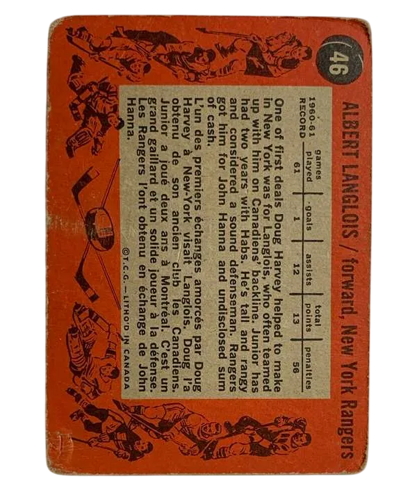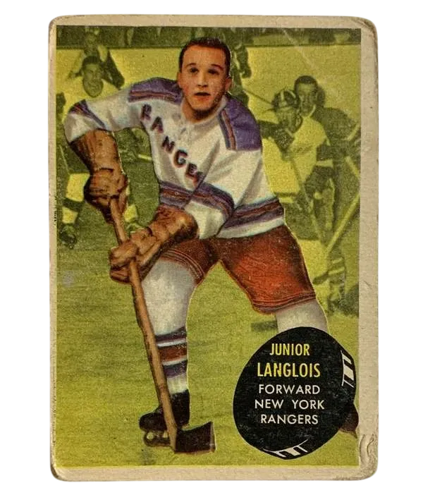 Delve into the history of ice hockey with the #46 Junior Langlois card from the 1961-62 Topps set. This vintage piece is a must-have for enthusiasts and collectors alike, featuring the legendary New York Rangers player during an iconic NHL season.