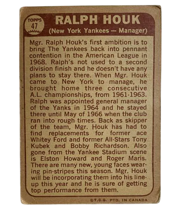 Step up to the plate with a slice of baseball history, the #47 Ralph Houk 1968 O-Pee-Chee Baseball Card. Embodying the spirit of America's pastime, this card features the New York Yankees' legendary player and is a must-have for any serious collector. Manufactured in Canada during the vibrant 1968 MLB season, this original piece of sports memorabilia is a vintage gem from the iconic O-Pee-Chee set. The card celebrates Joe Pepitone, capturing the essence of his athletic prowess and the era's excitement. A true testament to the golden age of baseball, it is an OPC parallel/variety, adding a unique layer to its collectability.Whether you're a devoted fan of the Yankees, a connoisseur of vintage cards, or someone who appreciates the artistry of the sport, this card is an exceptional addition to any collection.