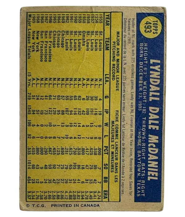 Capture a piece of baseball history with the #493 Lindy McDaniel 1970 O-Pee-Chee Baseball Card. This vintage collectible features the left-handed pitcher who made his mark with the New York Yankees, offering fans and collectors a tangible link to the past era of Major League Baseball. Crafted in Canada during the peak of the 1970 O-Pee-Chee set, this card is a must-have for enthusiasts of the sport. It's not just a card, but a tribute to an athlete who made significant contributions to the game, and a nostalgic piece for those who cherish baseball's rich history.