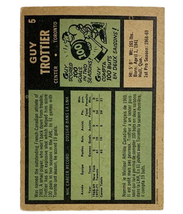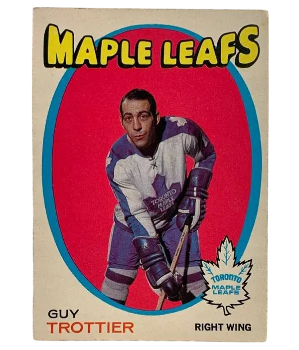Capture a piece of ice hockey history with the #5 Guy Trottier Rookie Card from the 1971-72 O-Pee-Chee set. Celebrating his debut season with the Toronto Maple Leafs, this card is a treasured keepsake for fans and collectors alike. The card is crafted from durable card stock, ensuring it remains a pristine piece of the National Hockey League's storied past. Authentically Canadian and steeped in vintage appeal, it's a genuine original from the 1971 year of manufacture. The card features the sought-after Rookie designation and comes with autograph authentication by Leaf, adding an extra layer of authenticity and value. Embrace the legacy of Guy Trottier and the rich heritage of the NHL with this classic collectible.