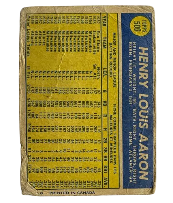 Celebrate a piece of baseball history with the #500 Hank Aaron 1970 O-Pee-Chee Baseball Card. This original card captures the legendary player during his iconic career with the Atlanta Braves, showcasing his exceptional talent that has left an indelible mark on the sport.