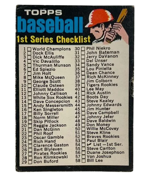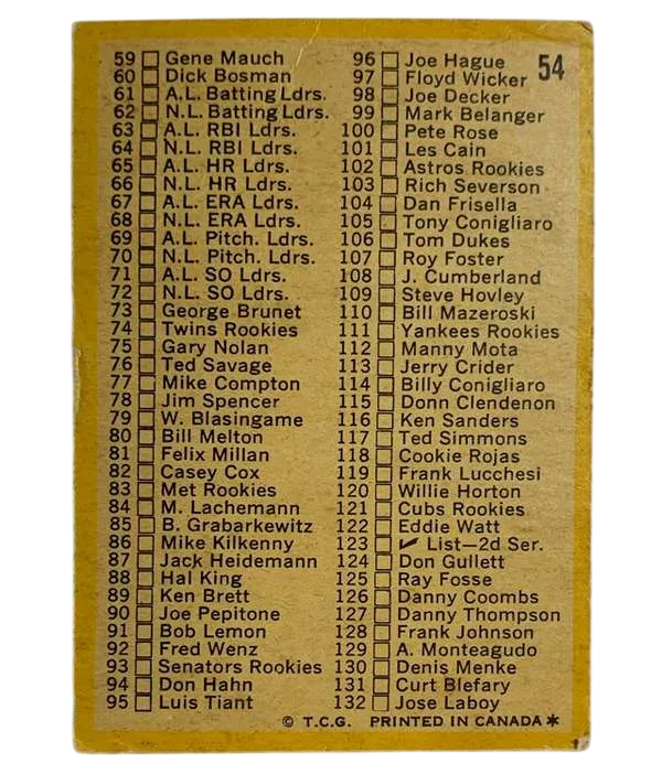 Add a rare piece of Canadian sports history to your collection with this original 1971 O-Pee-Chee Baseball #54 1st Series Checklist. Finding a 1971 checklist in unmarked condition is an increasingly difficult task for set builders. During the early '70s, most kids used these cards for their intended purpose—checking off their favorite players as they opened packs—making high-eye-appeal, unmarked survivors a sought-after subset in the vintage market.