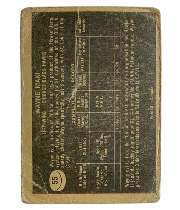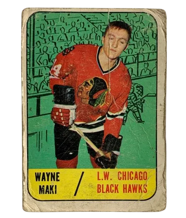 Embrace a piece of hockey history with this #55 Wayne Maki rookie card from the cherished 1967-68 Topps set. Celebrating an iconic era of the sport, this vintage card captures the essence of the National Hockey League's golden days. Originating from Canada, the card features the talented left winger who made his mark with the Chicago Blackhawks. Crafted during Maki's inaugural season, the card stands as a genuine slice of sports memorabilia. An original piece by Topps, it has been preserved unmodified, allowing fans and collectors to cherish the legacy of the ice hockey legend and the era that shaped the sport. This card is a must-have for enthusiasts seeking to add authentic vintage flair to their collection.