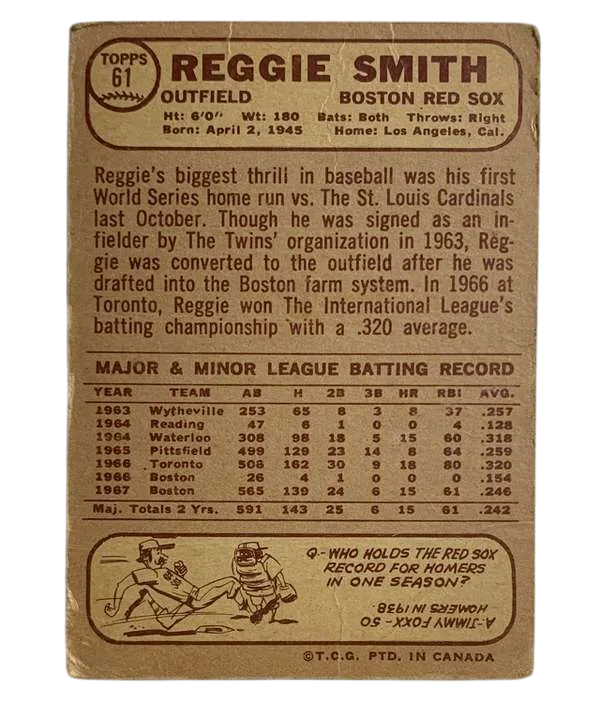 Step back in time with this authentic #61 Reggie Smith 1968 O-Pee-Chee Baseball Card, a true gem for collectors and enthusiasts alike. This original card, produced during the 1968 season, captures the essence of the era and is a must-have for those who appreciate the history of baseball and its legendary players. Crafted with care in Canada, this vintage piece from the renowned O-Pee-Chee set is an OPC parallel/variety, adding a unique layer to its collectability.