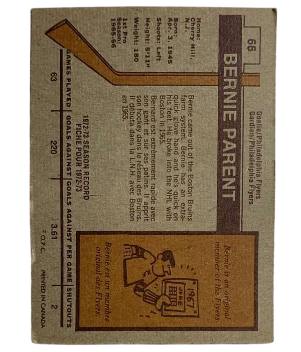 Capture a piece of ice hockey history with this #66 Bernie Parent 1973-74 O-Pee-Chee Hockey Card. Featuring the legendary Philadelphia Flyers goaltender, this card is a must-have for enthusiasts and collectors alike. From the classic 1973-74 season, it's a nostalgic nod to one of the sport's greats during a memorable era of the National Hockey League (NHL). Expertly crafted by O-Pee-Chee, this sports trading card is part of a renowned set that's revered by collectors for its quality and design. The OPC parallel/variety adds a unique touch to this already valuable piece. Whether you're looking to enhance your collection or gift a piece of the Philadelphia Flyers' storied legacy, this card checks all the boxes.