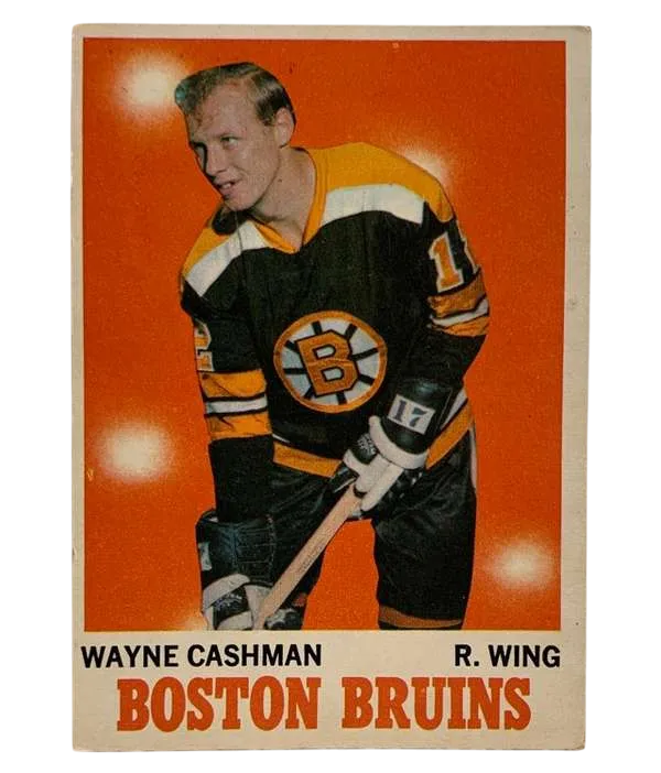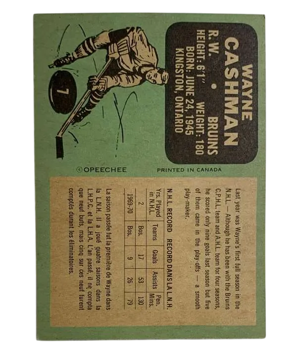 Celebrate a piece of ice hockey history with the #7 Wayne Cashman Rookie Card from the 1970-71 O-Pee-Chee set. Relive the beginnings of a legendary career with this original card featuring the Boston Bruins legend during his inaugural NHL season. Crafted in Canada, this vintage collectible is a must-have for enthusiasts and collectors alike. With its standard card size, this sports trading card fits seamlessly into any collection. It's a genuine piece of the National Hockey League's storied past, representing both the sport Cashman mastered and the team that made him famous. Own a snapshot of hockey heritage with this timeless rookie card.