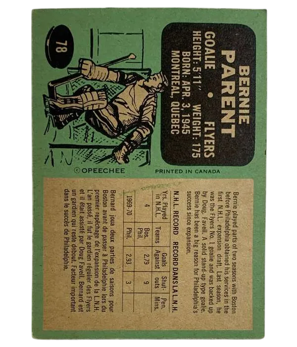 Embrace a piece of hockey history with the #78 Bernie Parent 1970-71 O-Pee-Chee Hockey Card. Celebrating his third year with the Philadelphia Flyers, this vintage card captures the essence of Parent's dynamic play that made him a standout goaltender in the NHL. Crafted with care in Canada, this original O-Pee-Chee card is a cherished collectible for any fan of the sport. While it remains ungraded, the card's authenticity and legacy are undeniable, making it a must-have for enthusiasts of ice hockey memorabilia.