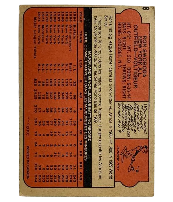 Capture a piece of baseball history with the #8 Ron Swoboda 1972 O-Pee-Chee Baseball Card. This vintage collectible features the New York Yankees' legend and is a must-have for enthusiasts and fans of the sport. Manufactured in Canada during the revered post-WWII era, this original card is a genuine piece of sports memorabilia. With its classic design and meticulous detailing, the card reflects the quality and craftsmanship of the era.