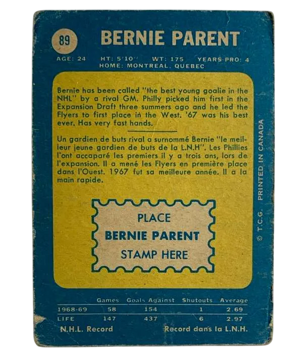 Delve into hockey history with the #89 Bernie Parent card from the 1969-70 O-Pee-Chee set, a must-have for collectors and fans alike. This vintage piece showcases the legendary Philadelphia Flyers player, capturing the essence of his impact on the sport during the height of his career. Proudly manufactured in Canada, this sports trading card is a tribute to the National Hockey League's golden days. As part of a storied collection, it brings a touch of nostalgia and a celebration of Ice Hockey heritage right into your hands.