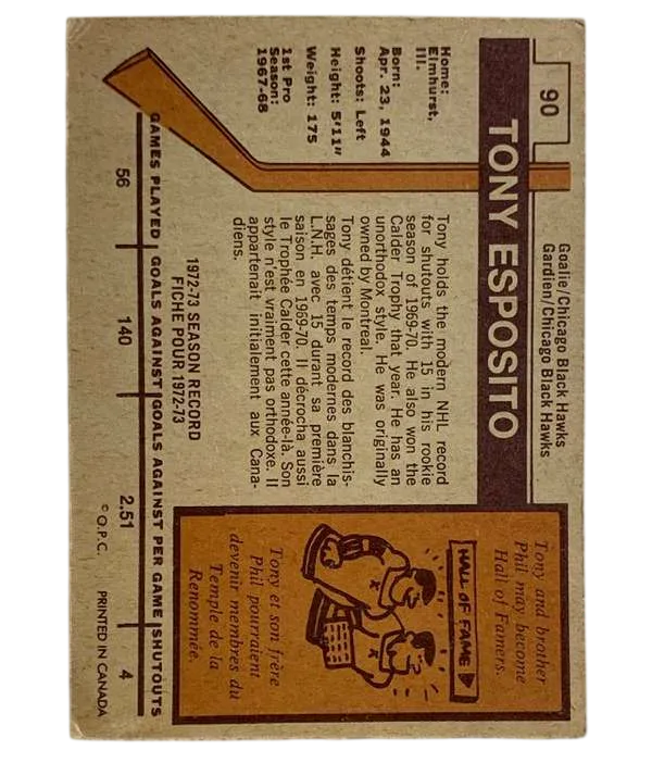 SOLD #90 Tony Esposito 1973-74 O-Pee-Chee – Light Backs