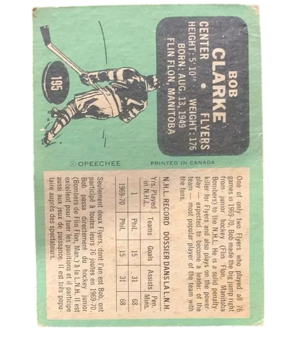 Experience a piece of hockey history with the #195 Bob Clarke rookie card from the 1970-71 O-Pee-Chee set. This iconic sports trading card features the legendary Philadelphia Flyers player, capturing the essence of his debut in the National Hockey League (NHL). A must-have for any serious collector, this card is a tribute to Clarke's impactful entry into the sport. Crafted in Canada, this vintage card is a genuine piece of the 1970-71 season, produced by the renowned manufacturer O-Pee-Chee. It's not just a collectible; it's a snapshot of Bobby Clarke's storied career and a cherished keepsake for fans of the game and collectors alike.