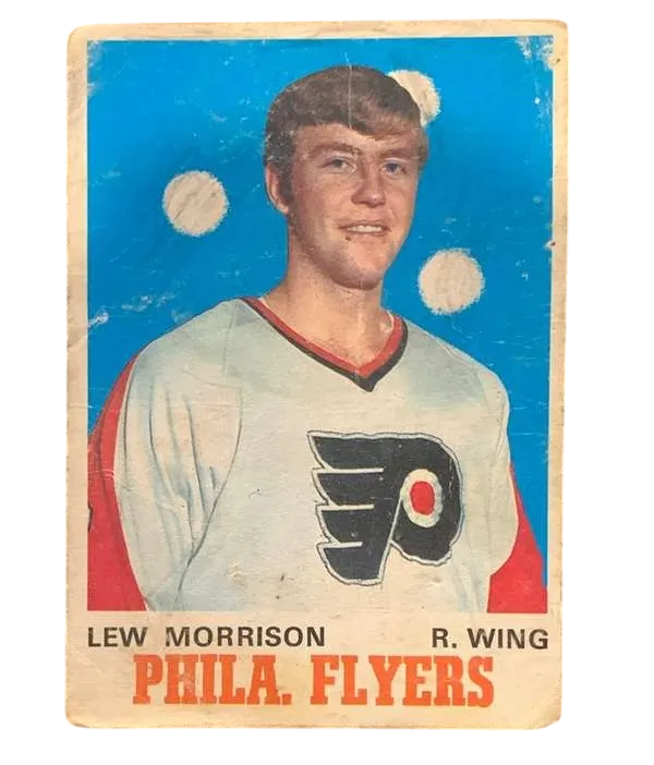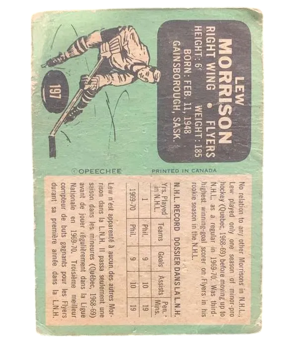 Delve into the history of hockey with this #197 Lew Morrison rookie card from the 1970-71 O-Pee-Chee set. Celebrate an iconic era in the NHL with this original piece of memorabilia featuring the Philadelphia Flyers' notable player. Crafted from durable card stock, this vintage card is a testament to the timeless appeal of ice hockey and its storied past. As a cherished collectible, this card is a must-have for enthusiasts and fans of the sport.